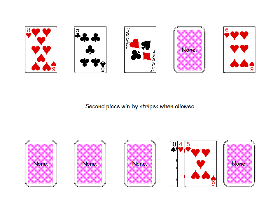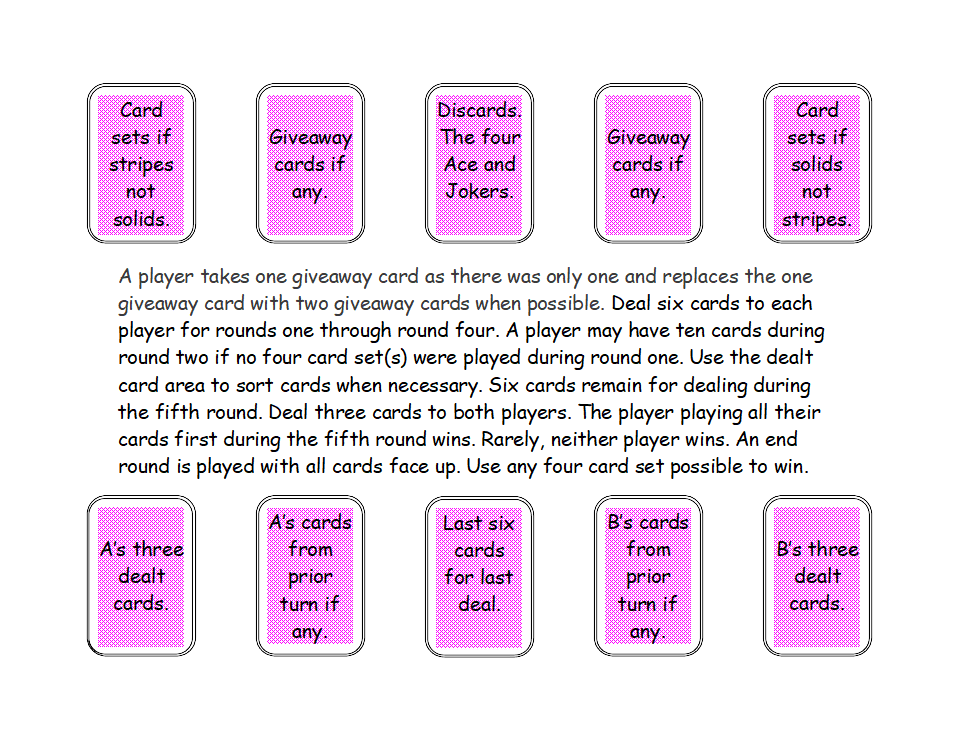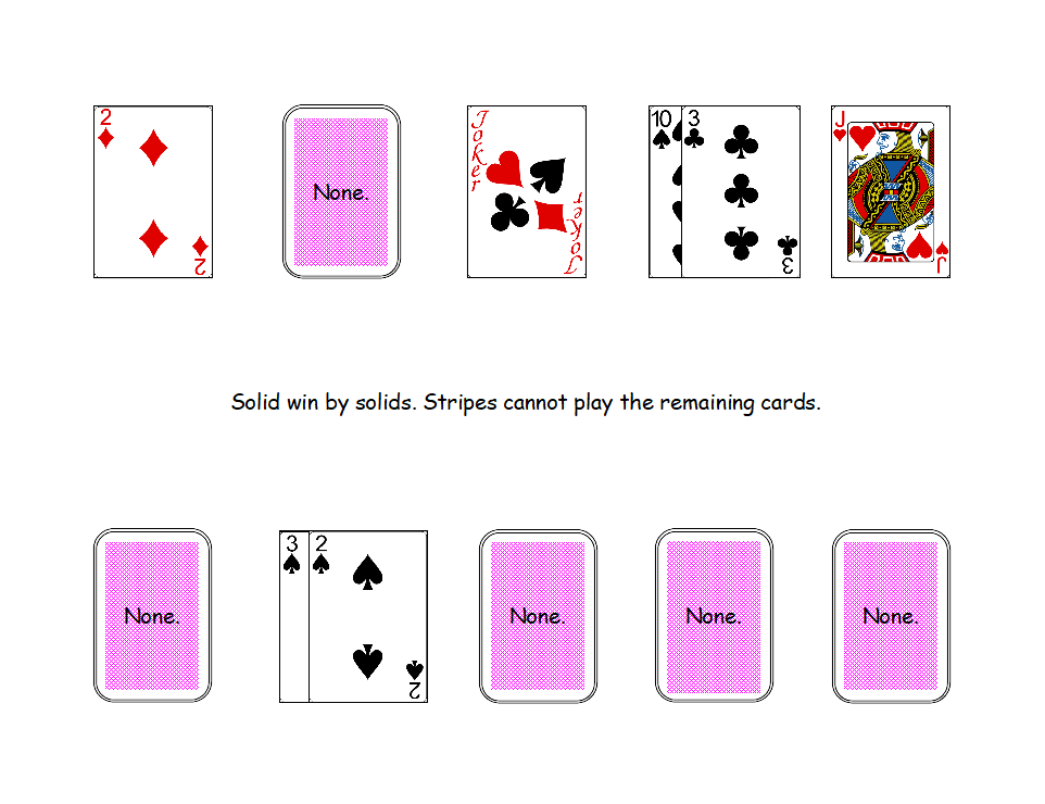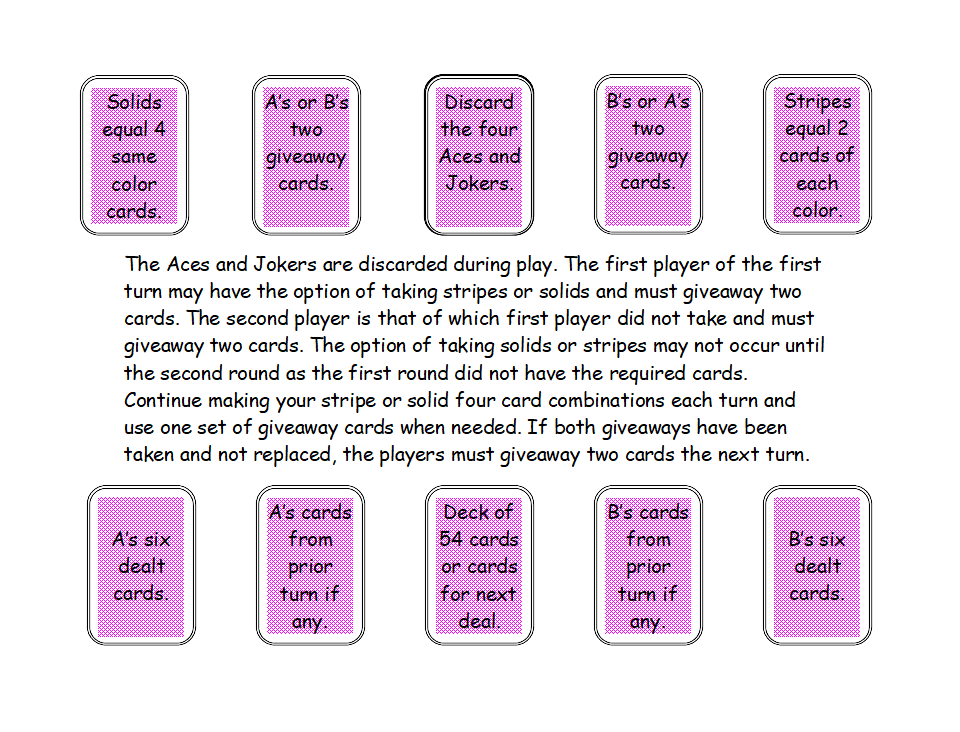 Gameplay: Collect four same color cards to make a solid card set. Collect two cards of one color and two cards of the other color to make a stripe card set. The player going first may choose stripes or solids by playing one of the two sets. The second player plays that which first player did not choose. Discard the Aces and Jokers.